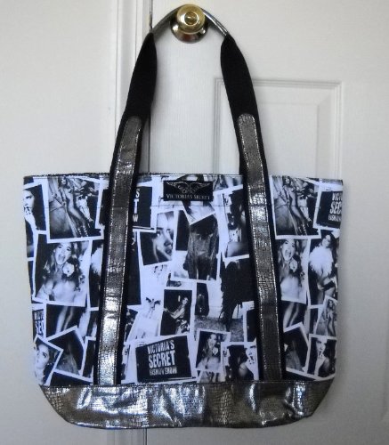 VICTORIAS SECRET SUPERMODEL ESSENTIALS BEACH/GYM/TOTE BAG;MEASURES APPROX 20.5" WIDE X 15.5" TALL (NOT INCLUDING THE HANDLES) X 6". BLACK / WHITE SUPERMODEL SNAPSHOT PRINT WITH SILVER CRACKLED METALLIC DETAILING. INSIDE POUCH POCKET, MAGNETIC SNAP CLOSURE. VICTORIA'S SECRET LOGO ON FRONT.