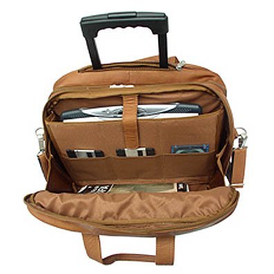 Two large zip compartments, bazk zip compartment with a three section divider for files, front zip pocket with padded compartment for a laptop and additional storage space, front pocket with full organizer, and a front and back zip-pocket. Telescopic handle, roller blade wheels, double top handles for easy carrying and an adjustable/detachable shoulder strap. Back strap for easy carrying on top of your luggage.