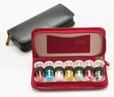 This genuine leather pill case includes 7 plastic pill vials to make a trip easier to pack for. Features a zippered closure and elastic bands to securely hold individual vials. Dimensions 7.25" x 3.25". Color: Red.