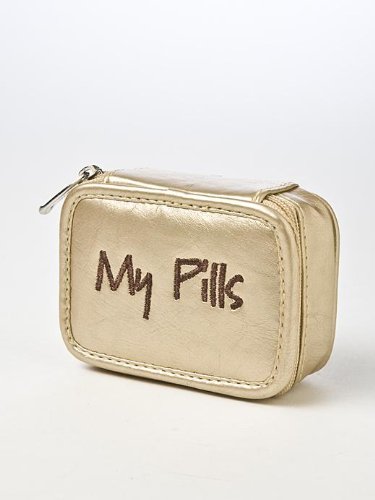 The Gold Metallic "My Pills" Pill Case is a fashionable, practical solution for carrying pills-on-the go. Compact design includes convenient plastic pill organizer, and the whimsical embroidery puts a smile on your face. Who knew taking pills could be so much fun.