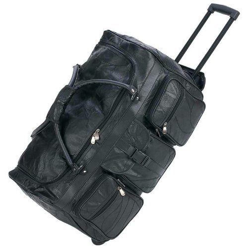 Features multiple pockets, locking telescopic trolley handle, double carrying straps with padded handle, reinforced bottom with wheels, and metal heavy-duty zipper-pulls. Measures 24rdquo x 13-1/4rdquo x 12rdquo.