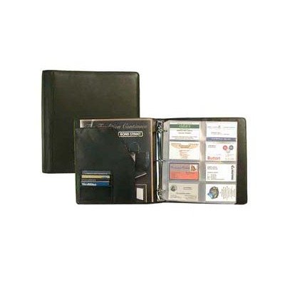 552108BLK Features: -Extra durable pages hold 160 cards and a ring binder that opens to place in refill pages or dividers to maximize organization.-Unique large sized card book. Includes: -Includes front business card pocket for easy access to personal cards. Construction: -Constructed of leather. Dimensions: -Dimensions: 10.25'' H x 10'' W x 1.75'' D.