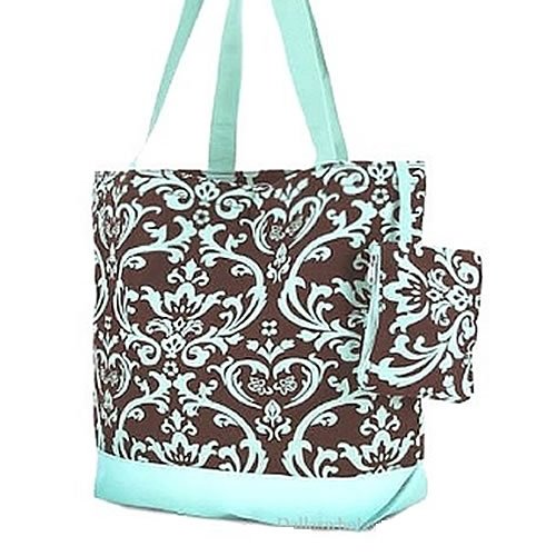 The possibilities are endless with this fabulous oversized tote bag. Throw it over your shoulder to take shopping or to the gym. Use it as carryon luggage for the chic jetsetter or a diaper bag for the fashionable mom on the go. In a fun brown and turquoise damask print with cute turquoise details, it makes an ideal overnight bag for slumber parties! Makes a great school bag and can handle text books and binders because it's made out of durable canvas and has sturdy straps. This light weight weekender bag is lined with nylon for easy cleaning. A spacious interior pocket keeps everything you need right at your fingertips. Metal feet keep your tote clean when resting on the floor. Features a top zipper closure, front zip pocket for added convenience, and comes with a matching attached coin purse!