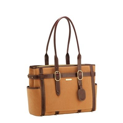 CBC-550-318 Color: Squash Features: -Dual zipper lid.-External side pockets.-Patented Crypton technology micro fabrics are stain resistant, water repellent, durable and lightweight.-Easy access to your umbrella, water bottle or sunglasses.-Dual post side expansion system.-Hardware: shiny gold.-Fits laptops up to 15''.-Also available in merlot, salsa, green tea, kale, blush, blue curacao, squash and raspberry. Includes: -Includes a brand tag that doubles as a lipstick mirror. Construction: -Constructed of Crypton micro suede with top grade leather trim. Color/Finish: -Leather trim color: cognac.-Lining color: begonia. Dimensions: -Laptop compartment dimensions: 10.75'' H x 14'' W x 2'' D.-Overall dimensions: 11.5'' H x 14.75'' W x 5.5'' D.
