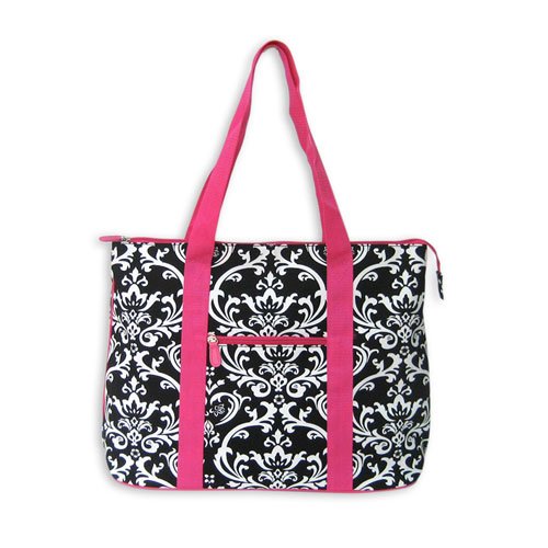 This is just an all around great bag. Large enough for all your needs! Great for groceries, laptop, school books, folders, you name it and this bag will fit the need.Damask and hot pink design on canvas material. Another one of those "do-all" bags you can't be without.