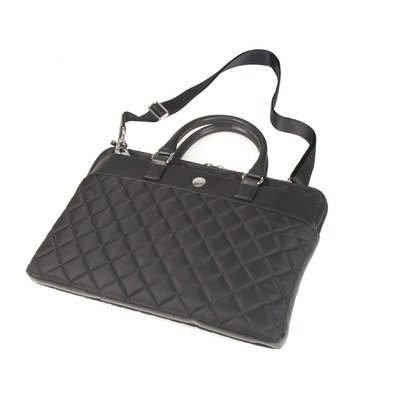 24-204-BLK Color: Black Features: -Constructed of quilted-nylon. -Trimmed in black textured-material, detailed with nickel-colored hardware. -Front and back slide pockets. -Detachable adjustable shoulder strap in webbed-nylon. -Eggplant-colored lining with soft "peach" hand-feel. -Signature front Knomo pocket with zip closure and small slider-pouch. -Built-in padded laptop-sleeve protects a 15" computer. -Dimensions: 1.2" H x 15" W x 11" D.